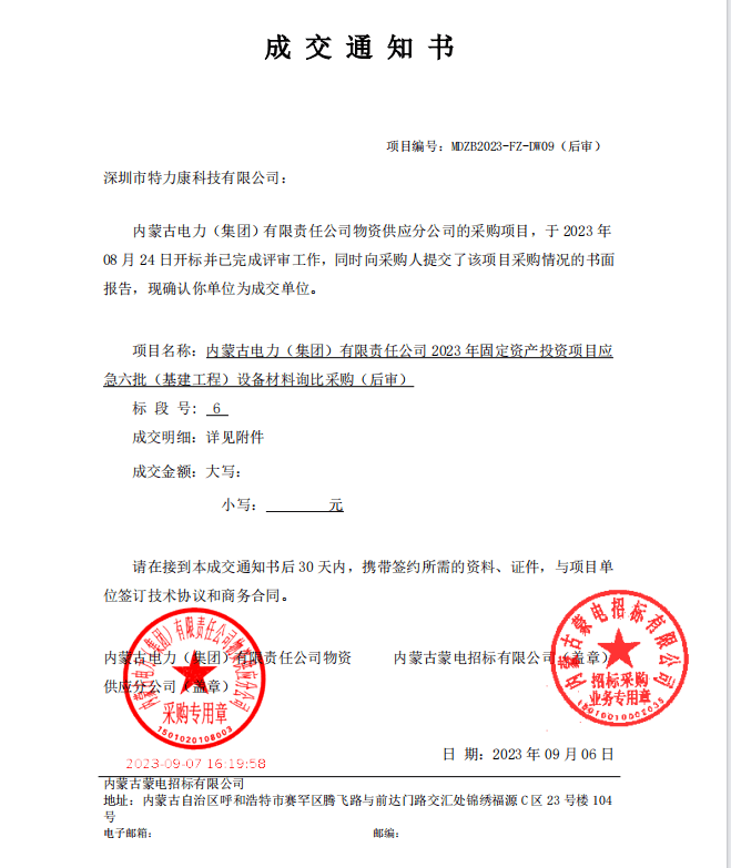內(nèi)蒙古電力(集團(tuán))有限責(zé)任公司物資供應(yīng)分公司的采購(gòu)項(xiàng)目,于2023年08月24日開標(biāo)并已完成評(píng)審工作,同時(shí)向采購(gòu)人提交了該項(xiàng)目采購(gòu)情況的書面報(bào)告,現(xiàn)確認(rèn)我單位為成交單位,中標(biāo)通知如下:
