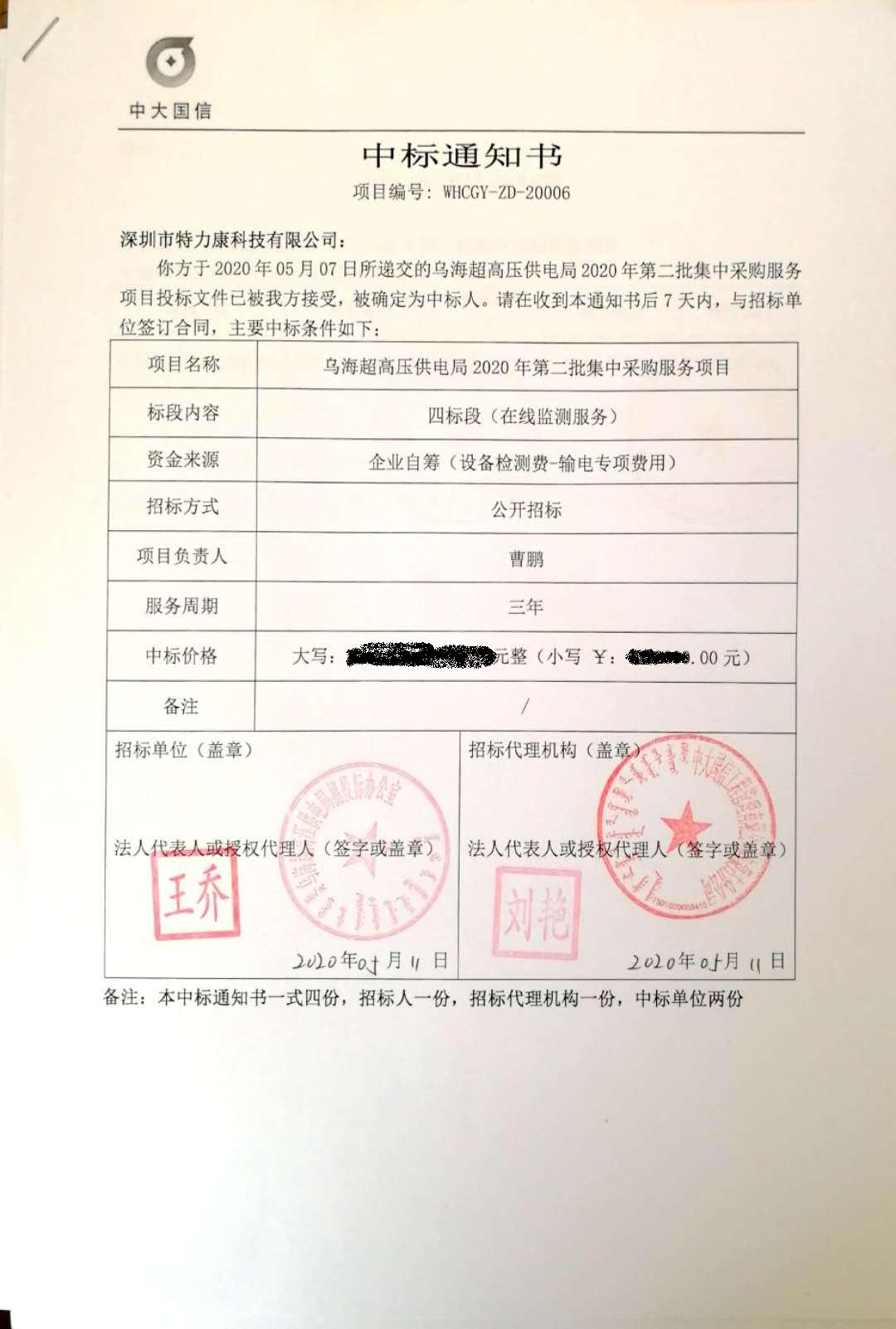 經(jīng)招標(biāo)領(lǐng)導(dǎo)組批準(zhǔn),我司于2020年05月07日所遞交的烏海超高壓供電局2020年第二批集中采購(gòu)服務(wù)項(xiàng)目(四標(biāo)段:在線監(jiān)測(cè)服務(wù))投標(biāo)文件已被局方接受,被確定為中標(biāo)人。特發(fā)中標(biāo)通知書(shū),如下: