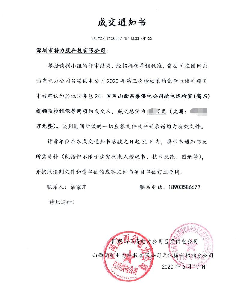 根據談判小組的評審結果,經招標領導組批準,我司(深圳市特力康科技有限公司)在國網山西省電力公司呂梁供電公司2020年第三次授權采購競爭性談判項目中被確認為其他服務包24:國網山西呂梁供電公司輸電運檢室(離石)視頻監(jiān)控維保等兩項的成交人,現中標通知以下: