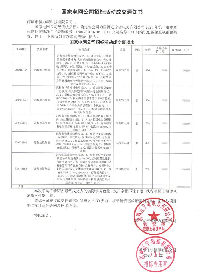 國家電網(wǎng)公司經(jīng)依法招標(biāo),確定我司(深圳市特力康科技有限公司)為國網(wǎng)遼寧省電力有限公司2020年第一批物資電商化采購項目(采購編號: LNDL2020-G- -DSH-01)貨物名稱: AI 前端識別圖像監(jiān)視拍攝裝置,包1,下表所列事項采購貨物中標(biāo)人(附件如下)。