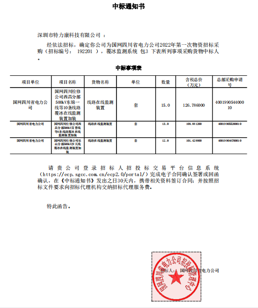 深圳市特力康科技有限公司:經依法招標,確定你公司為國網四川省電力公司2022年第一次物資招標采購(招標編號: 192201 ),覆冰監測系統包3下表所列事項采購貨物中標人,中標通知如下: