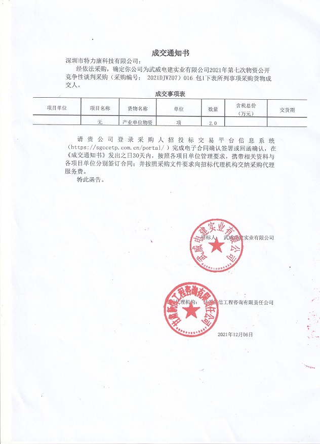 經(jīng)依法采購,確定我司為武威電建實業(yè)有限公司2021年第七次物資公開競爭性談判采購(采購編號: 2021DJWZ07) 016包I下表所列事項采購貨物成交人。成交通知如下: